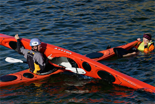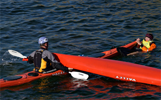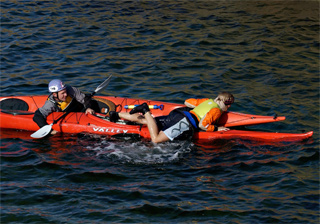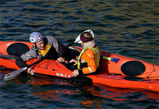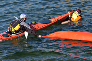 Plasser så den andre kajakken butt i butt med din egen og trekk den opp mot deg slik at du kan gripe kajakken sikkert ved sittebrønnen og stabilisere den mens den andre padleren klatrer ombord.